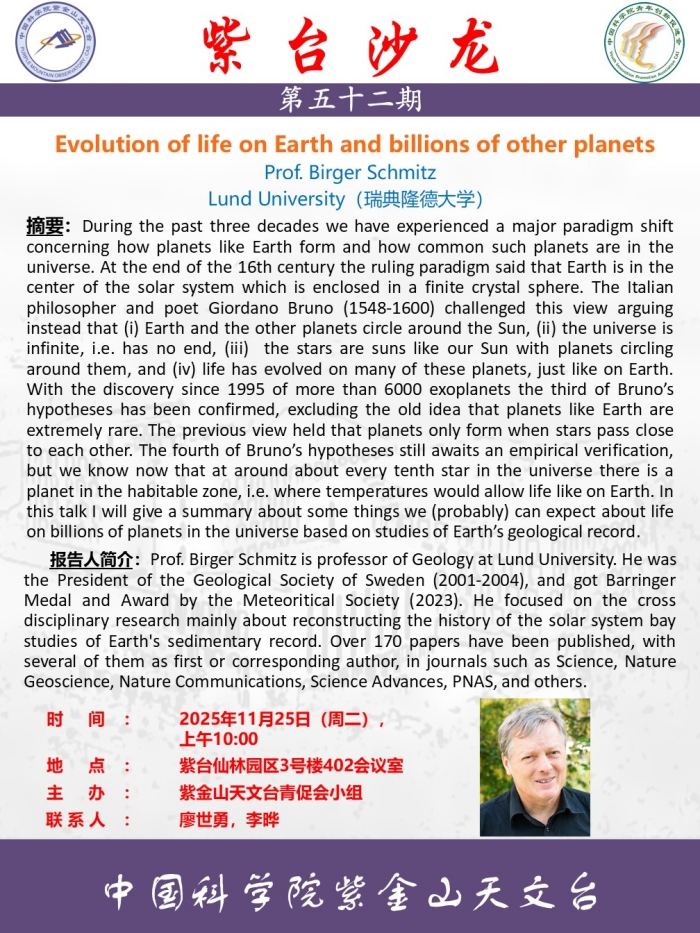 “紫台沙龙”第五十二期:Evolution of life on Earth and billions of other planets