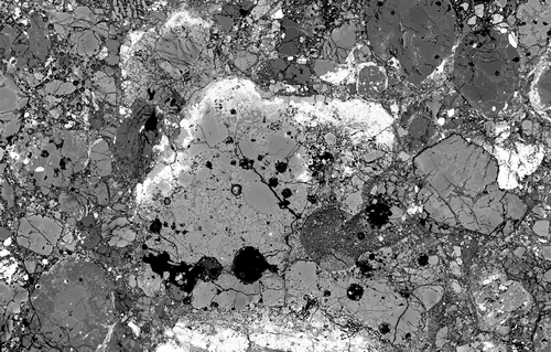 图片描述:这是一块来自小行星带的普通球粒陨石,由于经历了最少的热变质和水蚀变,完整地保存了其小行星母体的特征。这些球状结构的物质,称为球粒,是早期太阳星云中形成的,透过这些约1毫米的球粒以及球粒之间的细小的基质颗粒,我们可以发现原太阳形成之初甚至太阳系外的颗粒,从而解读太阳系形成之谜。