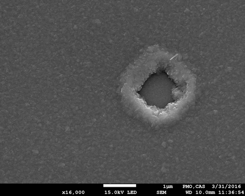图片描述:本作品咋看似星球表面的陨石坑(环形山),但其实它的尺度在微米(10-6米)量级,是一种太赫兹(1012赫兹)波探测器核心区域的显微图像,其放大倍率16000倍。该探测器基于超导晶体材料,在图片中可见大量尺度在纳米(10-9米)量级的多棱小晶粒。图片中环形凹陷部分恰似人眼,能“看见”非常微弱的太赫兹波信号,从而极大的助力天文学家开展太赫兹波段的天文观测研究。