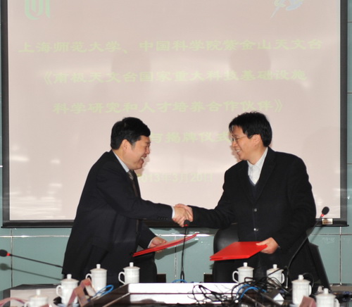 3月20日上午,紫金山天文台与上海师范大学(以下简称上师大)联合建立的“南极天文台国家重大科技基础设施科学研究和人才培养基地”签约揭牌仪式在上师大外宾楼举行。紫金山天文台杨戟台长、史生才研究员,上师大张民选校长、校长助理刘晓敏、上海市科委、市教委以及上师大与紫台相关部门负责人出席会议并分别讲话。