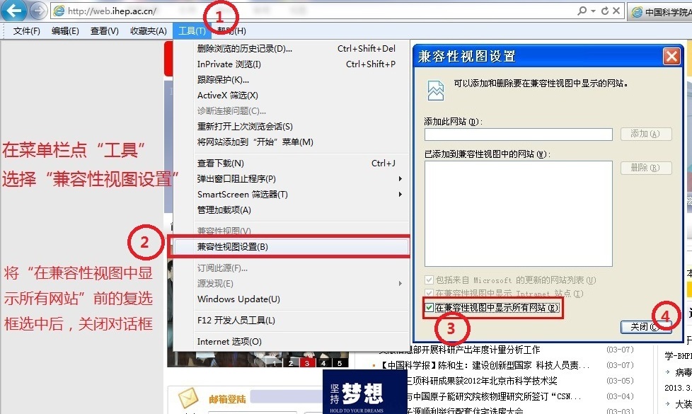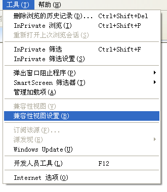 7、在菜单栏点“工具”选择“兼容性视图设置”,将“在兼容性视图中显示所有网站”前的复选框选中后,关闭该对话框