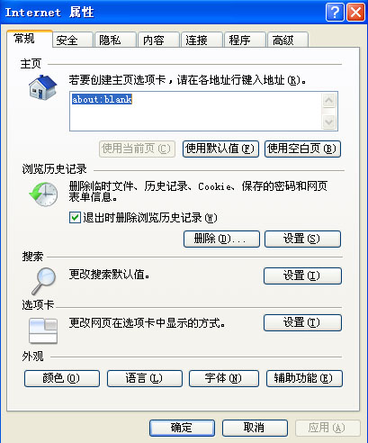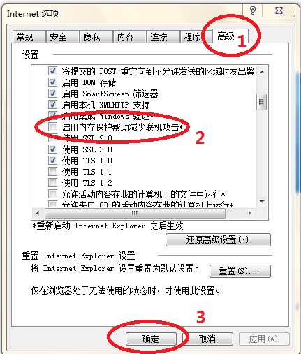 在“Internet选项”对话框中点击“高级”标签,将“安全”中的“启用内存保护帮助减少联机攻击”项前的复选框对勾去掉,点击“确定”关闭属性对话框。
