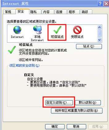 4、关闭“可信站点”对话框回到“安全”页面,仍点击选中“可信站点”图标,点击下方“自定义级别”按钮