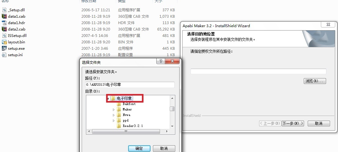 2、安装Maker中的文件,双击setup.exe 应用程序,按默认方式进行安装,中间会提示指定授权文件所在的位置,该文件(MakerKey.lic)在电子印章/目录下。