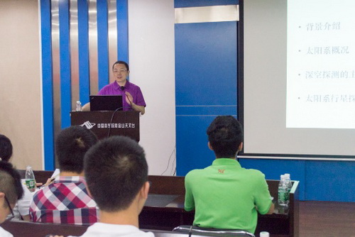 7月15日上午,夏令营开营,首先,紫台副台长常进致开幕词,也为期一天的学术报告活动拉开序幕。常进研究员从时间、空间、天文望远镜的发展史,结合紫台现阶段各研究团队研究方向,言简意赅讲述了天文学研究的对象、方法和现代天文前沿科学技术领域。幽默诙谐的言语让营员们深感天文学的魅力。史生才研究员作《太赫兹超导探测器技术》报告,介绍射电望远镜系统的组成,ALMA,SKA以及南极天文相关内容,范一中研究员、刘四明研究员、纪丽研究员分别作《暗物质粒子探测卫星项目及紫台的科学组》、《宇宙中的高能粒子》、《宇宙伽玛射线暴》、《Spectroscopy in High Energy Astrophysics》一系列学术报告,下午,营员们聆听了一场别开生面的关于人生哲学的报告——中国科学院大学马石庄副校长的《感性的人与能动的实践》,老师从“人为什么活着”到“对人生的看法”,并引用西南联大的精神告诫营员们:“身处逆境,而正义必胜的永不动摇信念,以及对国家民族的前途所具有的高度责任感,曾启发和支撑了西南联大师生对敬业、求知的追求”。随后,季江徽研究员、陈学鹏研究员、汪宏波博士分别作《行星科学:一个充满活力的前沿科学领域》、《分子云与恒星形成》、《人造天体动力学与探测》等学术报告。营员们深深体会着研究员们的精彩报告,并与他们沟通交流,研究员老师们深入浅出的回答激发了营员们对科研的兴趣,这为他们以后更深入的学习奠定了一定的基础。