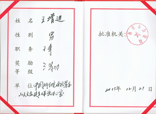 长期以来,中国科学院紫金山天文台安全保卫工作在单位党政领导的高度重视和公安机关具体指导下,取得了优异成绩。做到无火灾、刑事治安案件,无安全生产、环境保护事故发生,确保了重大科研活动的安全。2011年12月29日,为表彰紫金山天文台王增进同志在安全保卫工作中所做出的突出贡献,经南京市公安局批准,给予王增进同志记个人三等功一次,颁发三等功奖章和证书。