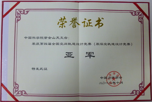 2012年10月13日,第四届全国空间轨道设计竞赛研讨会在北京举行。紫金山天文台行星科学和深空探测实验室团队提交的设计结果,获得亚军。