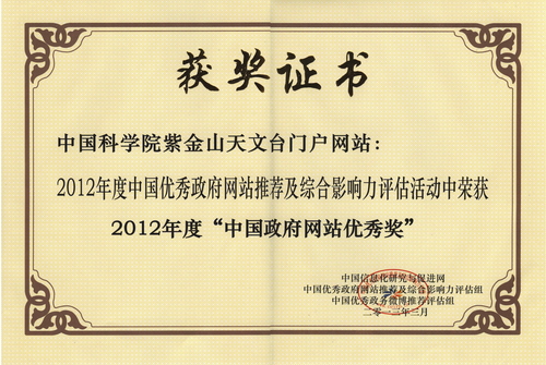 12月25日,2012年中国优秀政府网站推荐及综合影响力评估结果正式公布。中科院紫金山天文台中文网站荣获“中国政府网站优秀奖”。这是继2011年之后紫金山天文台第二次获得此奖项。中国科学院、中科院心理研究所、中科院大连化学物理研究所均获此殊荣。