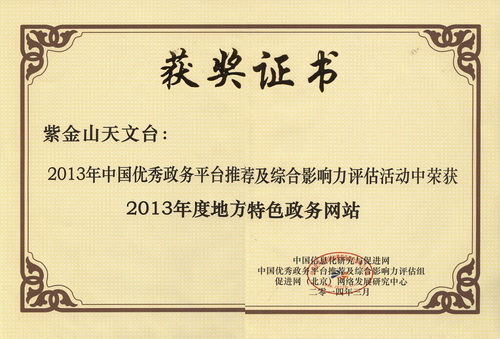 2013年12月26日,2013年中国优秀政务平台推荐及综合影响力评估结果正式公布,紫台门户网站荣获2013年度中国创新型政务平台地方特色政务网站奖。2013年度中科院系统还有院网站和大连化学物理研究所网站获奖。