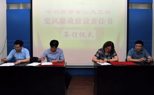 为全面落实党风廉政建设责任制,6月29日下午,中国科学院紫金山天文台召开大会举行2015年度党风廉政建设大会暨党风廉政建设个性化责任书签订仪式。台领导班子成员、两委委员、职能部门、支撑系统负责人、团组负责人代表等近110人参加了会议,会议由党委书记张丽萍主持。