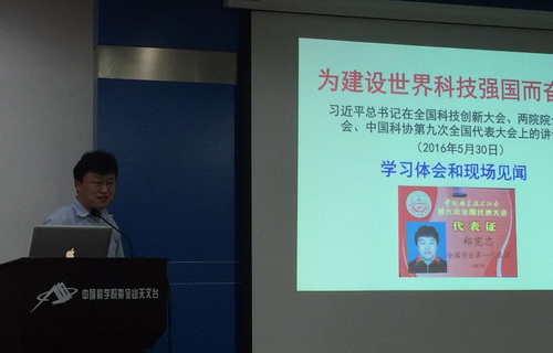 2016年6月3日上午,紫金山天文台召开会议传达学习全国科技创新大会精神和习近平同志关于科技创新重要讲话精神。会议由杨戟台长主持,中国科协第九次全国代表大会代表紫金山天文台郑宪忠研究员向全体与会人员传达了大会盛况及会议精神。全台职工和研究生参加了会议。