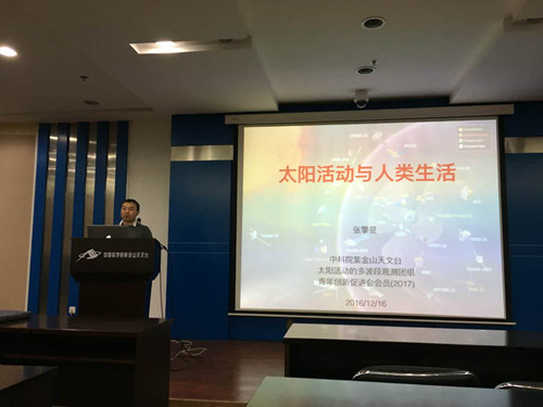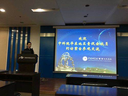 中科院南京分院人事处副处长周睿代表南京分院欢迎会员参加南京行活动,他突出强调了在青促会支持下南京分院的会员得到了快速发展,成为各研究所的骨干科研力量。紫台人教处副处长汪宏波代表紫台欢迎会员到来,并详细地介绍了紫台基本情况、以及紫台一三五规划中取得的突出科研成果。紫台青促会组长赵金松副研究员介绍了紫台青促会活动情况和活动经验。随后,紫台青促会会员孙荣煜、张擎旻和胡一鸣分别学术报告了“空间碎片的光学观测”、“太阳活动与人类生活”和“暗物质卫星与空间高能粒子探测器设计”,介绍了相关方面的研究内容以及研究进展。