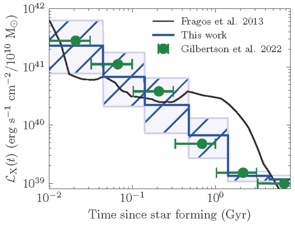 图2: 图中展示了 X 射线双星亮度随年龄演化的轨迹。与理论模型(黑色实线)预测的长达十亿年的高亮度“平台期”不同,本研究(蓝色实线及阴影)发现这些天体的亮度在形成后便持续下跌。