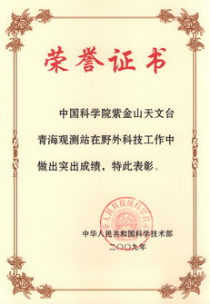 这次会议对在野外科技工作中做出突出成绩的个人和集体颁进行了发表彰。46个科研集体被授予“全国野外科技工作先进集体”称号。紫金山天文台青海站观测站作为一个先进集体受到科技部的表彰,常务副台长杨戟代表先进集体上台领奖。杨戟代表台领导班子向长期辛勤工作在青海观测站的全体同志表示热烈的祝贺和诚挚的慰问!(综合办供稿)