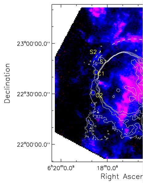 图1 13CO积分强度为红色,12CO积分强度为蓝色,contour图为射电1.4GHz连续辐射