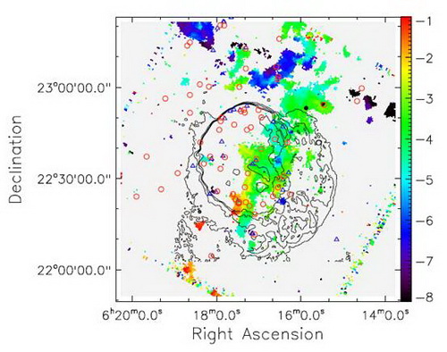 利用紫金山天文台青海观测站13.7米毫米波射电望远镜,我们对超新星遗迹IC 443进行了CO三条分子谱线的观测。整个OTF观测覆盖了2.25平方度的天区,首次揭示了环绕这个超新星遗迹北部的连续分子壳层结构和遗迹东侧的离散分布的分子云团块结构(f7a)。我们认证出具有【-5,-2】km/s的分子云气体与这个超新星遗迹有物理联系并且位于遗迹的前景(f11b)。利用WISE和2MASS红外数据,我们还发现了62个年轻星候选体聚集在IC 443的视场内,这些年轻星候选体主要集中在超新星遗迹的射电辐射边缘,很可能是被遗迹的前身星的剧烈活动(例如紫外辐射,星风等)触发的。