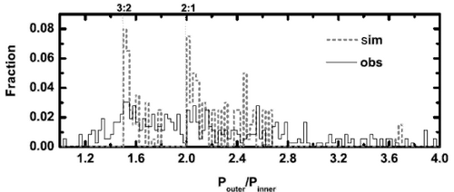 紫台研究人员提出了这一类特殊行星系统的形成机制:首先,行星形成于距其中心恒星较远的区域,但行星与气体盘的相互作用直接导致行星在演化中各自经历不同类型的向内轨道迁移(即轨道半长轴逐渐减小)。进而,这些行星在迁移过程中被锁定在平运动共振区域,即从内向外每两颗行星的公转周期分别接近于简单整数比。由于气体盘消失等因素阻止了行星的进一步迁移运动,从而使它们停留在中心恒星的周遭。伴随着恒星的长期潮汐作用,行星的公转轨道逐渐变得越来越圆,并最终形成目前的近共振构型。研究人员统计分析后发现数值模拟结果与Kepler数据(图1)在1.5与2.0峰值处吻合较好。研究还表明恒星磁场对最终构型的影响较小;高恒星吸积率易形成2:1共振而低恒星吸积率则对形成3:2共振有利;第一类轨道迁移速率的大小亦对共振构型的形成有影响。因此,研究工作揭示了Kepler所发现的众多近3:2与2:1共振行星系统的形成机制,对其他低质量短周期系外行星共振构型的形成亦有重要启示。