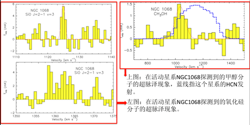 上海天文台王均智研究员和他的合作者利用位于西班牙的IRAM 30米毫米波望远镜在近邻的活动星系NGC1068中测到了氧化硅(SiO)以及甲醇(CH3OH)分子的超脉泽发射,如图所示。王均智研究员说,“基于我们的探测,我们预计氧化硅脉泽来自非常靠近星系中心黑洞的高温气体盘,而甲醇脉泽来自喷流区域。由于这些超脉泽的探测还只是初步结果,需要进一步的高灵敏度高空间分辨率观测来详细研究宿主星系的性质。”王均智研究员2005-2007间曾在紫金山天文台高煜研究员团组做博士后。
