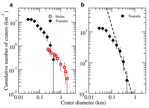 在该项工作中,研究人员利用嫦娥二号探测数据,在图塔蒂斯小行星表面共识别出200多个碎石,大小从10米到61米不等(图1)。对碎石的累积大小频率分布统计显示,它们呈现较陡的斜率(-4.4 ± 0.1)(图2),表明自形成以后遭受了较高程度的破碎过程,或来自后续撞击改造,或来自小行星表面昼夜温差变化引起的热疲劳(Thermal fatigue)。研究表明,大部分大于20米的碎石不是小行星表面撞击过程形成的溅射物,而是图塔蒂斯小行星母体形成时的残留碎片。这为其碎石堆(Rubble-pile)的结构成因提供了有力的证据。此外,撞击坑的累积大小频率分布图显示,图塔蒂斯表面的撞击坑保留年龄约为16亿年(图3)。与日本隼鸟号探测的丝川小行星(Itokawa)相比,同样作为近地小天体,图塔蒂斯和丝川小行星表面的碎石均相对均匀分布,而不是集中在撞击坑的周围。不同的是,图塔蒂斯表面的碎石分布斜率陡得多,可能与热疲劳过程有关。该项成果为研究小行星的形成演化和撞击历史提供了重要线索。