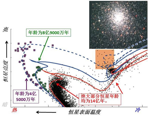 银河系的球状星团都十分年老。为了研究更为年轻的样本,该研究团队对银河系外的两个卫星星系,即大、小麦哲伦云中的中等年龄星团进行了筛查。团队在研究工作中关注的是大麦哲伦云中编号为NGC1783、NGC1696,小麦哲伦云中编号为NGC411的三个特征突出的星团。通过精确测量和仔细分析这些星团中恒星的亮度和颜色,他们得到了可靠的结论。以星团NGC1783为例,其大部分的恒星年龄都在约14亿年左右,而新形成的两批恒星年龄分别约为4亿5000万年和8亿9000万年。