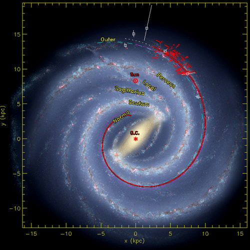 图1.银河系俯视图。红色圆圈为位于外旋臂的分子云,红色虚线为拟合得到的外旋臂位置,红色实线为参考Reid et al. (2014)拟合的结果,平移所得的外旋臂位置。