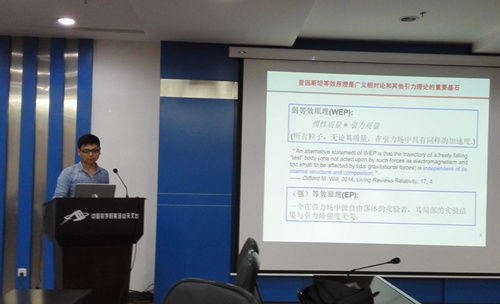 魏俊杰博士报告题目是“利用河外暂现源检验物理学一些基本原理”,报告首先简要介绍了伽玛射线暴、快速射电暴以及最新发现的引力波暴等河外高能暂现源的观测特征,随后说明了如何利用这些河外暂现源开展物理学一些基本原理和假设的高精度检验,最后介绍了自己团组与国际团队的最新研究工作,包括检验狭义相对论中的洛伦兹不变性、光子静止质量为零和广义相对论中的弱等效原理等,并对今后的工作进行了展望。本次报告激发了大家极大的兴趣,纷纷针对光子静止质量是否为零、洛仑兹不变性和广义相对论中的弱等效原理等问题进行了热烈的讨论。本次报告加深了大家对物理学的一些基本原理的理解,开阔了思路,同时也为日后在相关领域的合作研究奠定了前期基础。