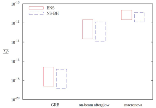 尽管上述结论依赖Fermi/GBM伽马射线信号的真实性,但在2016年8月《天体物理杂志》(ApJ)的一篇论文中(http://dx.doi.org/10.3847/0004-637X/827/1/75),李翔、胡一鸣、范一中等人研究指出短伽马暴与引力波事件的成协性很有可能在未来几年内确立,并且引力波速度与光速的相对偏差可望被直接限制到10-18的精度(见图1)。该文中他们还首次给出了“同时进行引力波速度高精度直接测量及爱因斯坦弱等效原理检验”的研究方案。