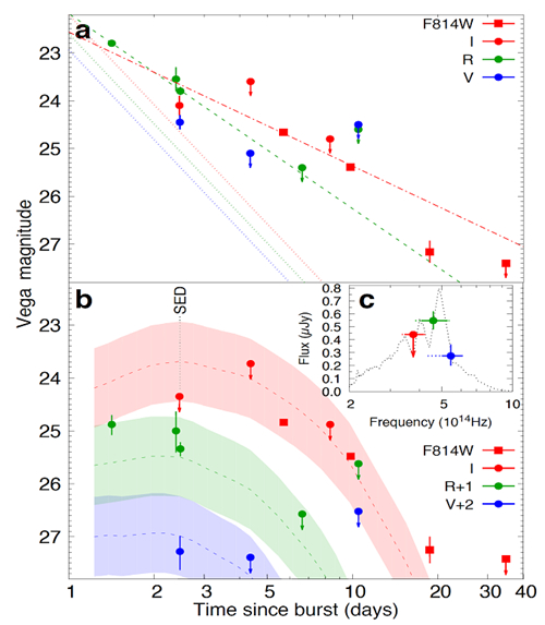 图2. (a) GRB 050709的光学辐射; (b) GRB 050709光学辐射扣除余辉成分后留下的“奇异”信号与“中子星黑洞并合模型预期的巨新星辐射”的比较; (c) 2.5天处的“奇异”能谱与一个巨新星模型预言的比较。图取自Jin et al. (2016).