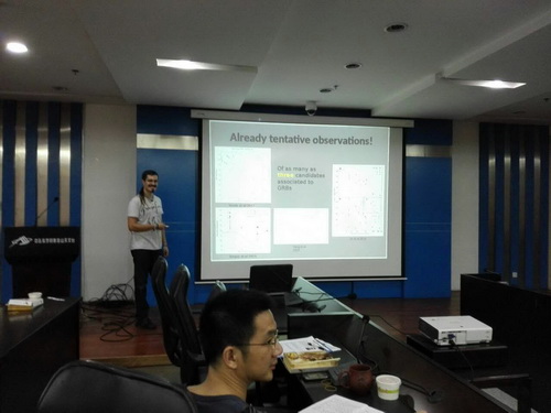中秋刚过,金桂飘香,紫金山天文台第十六期青年论坛于2016年9月26日在紫台如期召开。本次青年论坛由金志平副研究员主持,报告人为德国马普天体物理所和慕尼黑理工大学的博士生Ricard Ardevol Pulpillo,主要从事计算天体物理工作,特别是进行中子星-中子星和中子星-黑洞双星系统并合过程的流体动力学数值模拟和元素核合成。