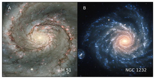 图1. 银河系原来普遍认为可能类似旋涡星系M51(A),现在看来可能像旋涡星系NGC1232(B)。