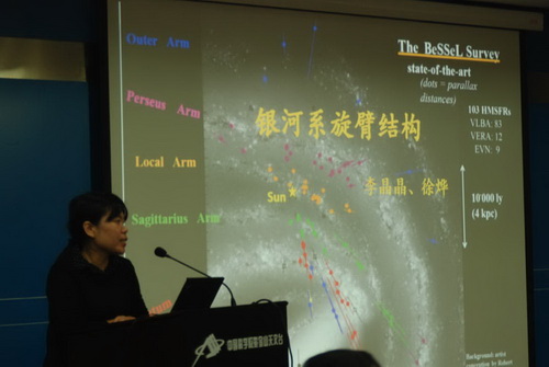 李晶晶简述了银河系结构的研究历史,描述BeSSeL项目中解决的技术难题,获得的空前的测量精度,以及由此带来的对银河系结构研究中数十年来的重大突破。随后对BeSSeL项目的发展前景以及与未来的其它大望远镜设备下重大项目的交叉应用做出了展望。报告十分精彩,得到了与会科研人员的热烈反映。大家就项目所采用的三角视差测量的技术细节、银河系本地臂的性质以及项目对银河系结构研究进展的进一步应用等诸多话题展开了热烈的讨论。