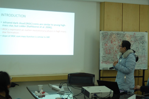 赵起同学为大家做了一场题为"Evidence for delayed massive star formation in the M17 proto-OB association"的报告。红外暗云中包含了很多正在形成的大质量恒星,所以研究红外暗云对于研究研究大质量恒星形成的早期环境非常重要。通过spizer和MSX对M17 SWex中红外暗云的观测数据进行SED拟合发现,M17 SWex中有很多年轻恒星天体(YSO)。仿照初始质量函数对这些YSO构建质量函数,文章发现YSO的斜率比初始质量函数的斜率更陡,经过对比分析发现M17 SWex中缺少按照恒星演化理论应该已经出现的大质量恒星,所以文献中作者认为这是大质量恒星形成延迟的证据。(Reference:Povich, M. & Whitney, B., 2010, ApJL, 714:L285)。报告之后,报告人与听众对红外暗云的性质、大质量恒星形成的条件、初始质量函数的普适性以及与原恒星质量函数的关系等诸多话题展开了广泛的探讨。在相互讨论、尤其是江治波研究员的解释下,大家对于大质量恒星的形成有了更为深刻的认识。