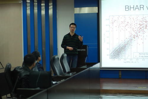 杨光报告题目:“Black Holes Grow More Efficiently in Massive Galaxies”。报告首先指出超大质量黑洞和它们宿主星系的可能共同演化仍然是一个悬而未决的问题。随后生动地展示了他与他合作者利用Chandra南天深场巡天的7百万秒观测数据(最深的X射线巡天),发现虽然观测上黑洞吸积率与宿主星系质量和恒星形成率都呈现正相关,但是本质上黑洞吸积率主要与宿主星系质量有关,观测到的和恒星形成率的关系实际上是一个次级效应。此外,他们还发现大质量星系拥有更高的黑洞吸积率与恒星形成率之间的比值,表明超大质量黑洞在大质量星系中成长更加有效。他们的观测结果可以很自然地解释近邻宇宙中的黑洞-星系质量关系。报告十分精彩,与会青年科研人员的反响热烈,大家就超大质量黑洞到底是在哪里成长的问题展开了热烈的讨论。