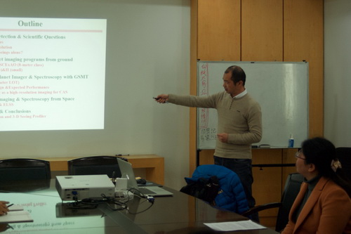 窦江培研究员的报告题目:“高对比度分辨率成像及其在系外行星探测和太阳观测领域的应用”。报告首先展示了目前观测到的系外行星,并介绍了高对比度成像技术在系外行星观测上的优势。随后生动的介绍了该团队近十年来发展的独特的高对比度成像技术及近期在国际中等口径望远镜(欧南台3.6米新技术、Apache Point天文台3.5米以及McDonald2.7米望远镜)开展的天文观测。该系统主要由非常便携的超级AO,星冕仪,后端图像处理技术组成。作为初步验证,系统能够达到100万倍的成像对比度,与国际Gemini/GPI 和 VLT/SPHERE大口径行星成像计划水平相当。其独特的便携式设计理念使得中小口径望远镜开展高对比度、高分辨率成像科学成为了可能。中小口径望远镜观测时间更为丰富,能够与国际再用的大口径望远镜开展互补观测。最后,报告还将介绍该团队在太阳高对比度成像,三维光谱,偏振磁场测量方面的研究工作以及三维视宁度测量方面的研究工作。报告十分精彩,与会青年科研人员的反响热烈,大家就系外行星的观测和理论相结合展开了热烈的讨论。