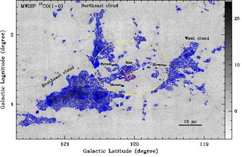 理论研究预测,单简并模型中的白矮星在吸积物质的同时会驱动星风,而持久的星风会在白矮星周围的星际介质中“吹出”一个巨大的空腔(半径10-30pc);但在双简并模型中,没有此类星风及空腔。因此,观测Ia型超新星遗迹并在其周围搜寻巨型空腔将是十分有效的判别其前身星的方法。以此为目标,紫台科研人员利用青海德令哈13.7米毫米波望远镜,在一项名为“银河画卷”的银道面CO分子气体巡天研究计划中,对Ia型超新星遗迹的典型对象第谷超新星遗迹展开了观测。