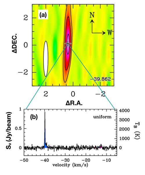 图二:(a)澳大利亚望远镜致密阵(ATCA)观测到的SiS (1-0)脉泽分布。(b)脉泽峰值处的谱线轮廓。