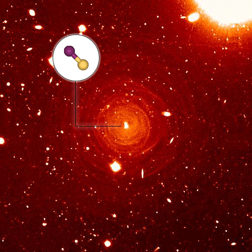 图一:背景是富碳星IRC +10216的光学图像,取自Leao et al. (2006)。左上圆圈内是硫化硅分子的示意图,黄色为硫原子,紫色为硅原子。