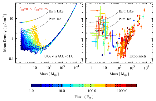 图1 模型得到的行星族群(左)和系外行星(右)在质量-平均密度图上的分布。该结果验证了模型所依赖的行星形成和演化理论。