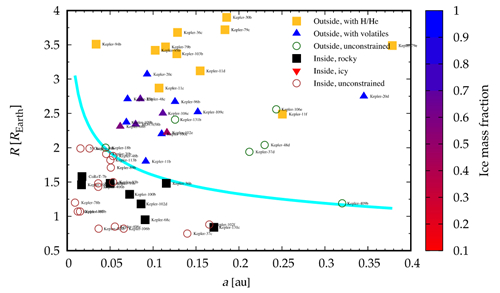 图3 已知低质量系外行星的半径和轨道半长径分布,以及由模型计算得出的行星整体物质成分。该图表明已知的低质量系外行星均与行星含有大量水的模型不符。
