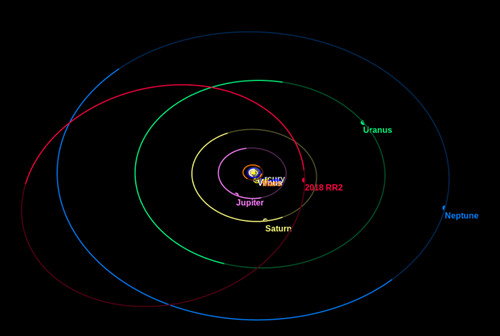 图1. 2018 RR2的轨道在太阳系外行星之间,图中Jupiter、Saturn、Uranus、Neptune分别是木星、土星、天王星、海王星