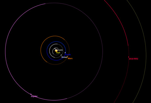 图2. 发现2018 RR2时候在其轨道的冲位置附近,由内向外分别是太阳、水星、金星、地球、火星、木星、2018 RR2和土星。