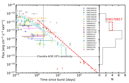 图2:将一些具有红移的明亮短暴以及GW170817/GRB 170817A的X射线余辉辐射移到一个共同的观测距离200Mpc后的统计图(图取自Duan et al. 2019)。显然,晚期快下降的数据形成了一个自然的序列。红虚线示意的是GW170817在正轴观测情况下的X射线流量随时间的演化。显而易见,它将是最亮的X射线余辉之一。