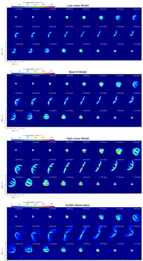 图1 不同原行星盘质量下的CO多通道图与ALMA观测对比。从上至下:低质量模型,最佳拟合,高质量模型。