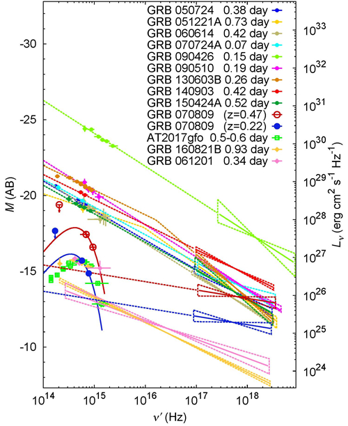 图1. 一些明亮短暴的早期光学、X射线能谱对比图。注意AT2017gfo是与GW170817/GRB 170817A成协的千新星,具有黑体谱。与其它伽玛暴相比,GRB 070809具有最软的光学谱及最硬的X射线谱。GRB 070809的红移z尚不确定,如果z=0.22,则其与AT2017gfo,GRB 160821B和GRB 061201的光学辐射谱颇为类似。如果z=0.47,则该千新星比同时期的AT2017gfo亮5倍左右。