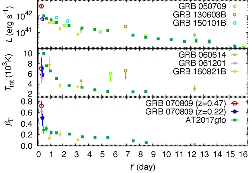 图2. 已知红移暴及GRB 070809中的千新星(候选体)的性质对比。L代表光度,Tint和t’分别代表红移修正后的温度与时间,βΓ代表的是辐射区的速度(以光速为单位)。从图可见,早期千新星的辐射区的温度及速度可能有较宽的分布范围。