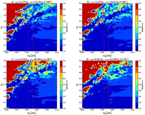 紫台研究团队分别采用数值模拟和理论分析方法,对该系统存在两颗行星的情况开展了深入的动力学演化和稳定性特征研究。考虑相对论效应和潮汐效应的情况,动力学演化结果表明:在一百万年左右的时间尺度上,Proxima b的轨道偏心率演化受到潮汐的影响很小,而相对论效应对两颗行星的影响比较明显。不考虑相对论效应和潮汐效应的情况,利用MEGNO积分器对系统稳定性的研究,描绘出了该系统稳定区域的整体图像(图2),揭示了两颗行星在共面和非共面时保持系统动力学稳定的行星参数限制。对于共面情况,内、外两颗行星的偏心率上限分别为0.4和0.65,此时Proxima b的半长轴范围为0.02 -0.1 au;对于非共面情况,两颗行星的轨道倾角低于50度。这些研究结果不仅有助于开展该系统的长期动力学形成演化及其形成机制研究,而且为后续系外行星的观测提供重要的理论参考。