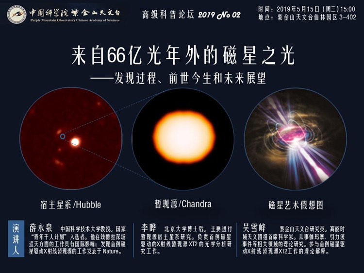紫金山天文台第二期高级科普论坛,邀请三位该项工作的作者,分别从钱德拉深场巡天中发现X射线暂现源、哈勃太空望远镜对宿主星系的证认、双中子星并合磁星解释等三个不同的视角,揭秘来自66亿光年外磁星之光的发现过程、前世今生和未来展望。