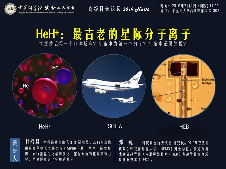 本期科普论坛邀请两位专家,分别从HeH+的来龙去脉、SOFIA计划以及HEB探测技术等三个不同的视角,解读宇宙第一分子离子的神秘身世和发现历程。