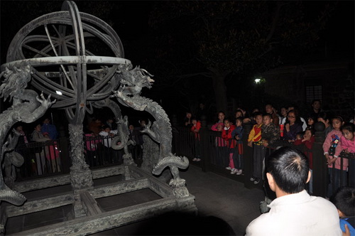 18点半,同学们在工作人员的带领下,兴致勃勃地参观了紫台科普园区,讲解员向同学们介绍了我国近代天文发展历程,并就同学们特别感兴趣的明清古代天文仪器作了详细讲解。