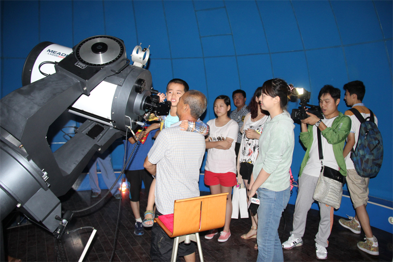 随后,大家来到天泰天文台的圆顶里,在紫金山天文台专家的指导下,用望远镜观看美丽的土星。绝大多数人都是第一次用望远镜观看土星,虽然后来天气不是很好,但土星那迷人的光环还是吸引了大家一遍又一遍的排队观看。